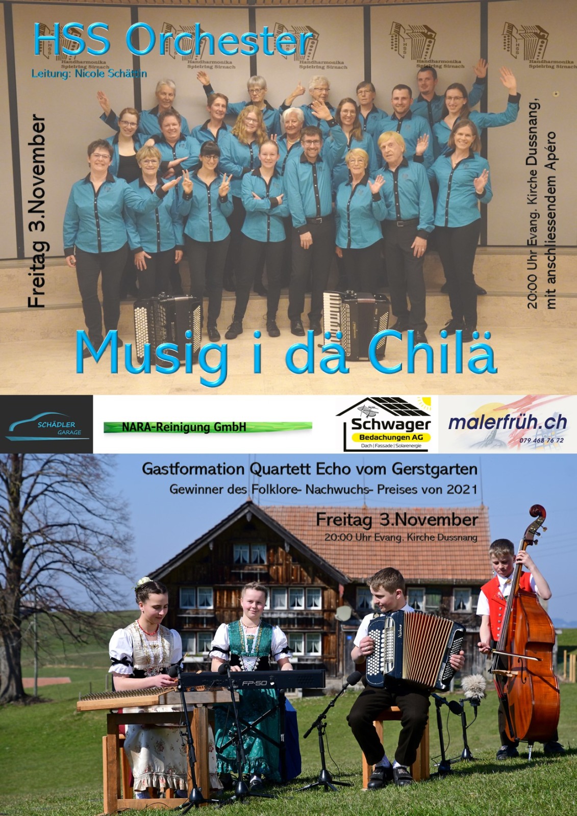 Am Freitag, 3. November 2023 um 20.00 Uhr lädt der HSS ein zu „Musig i dä Chilä“ in der evangelischen Kirche Dussnang. Nebst dem HSS wird als Gastformation das Quartett Echo vom Gerstgarten, Gewinner des Folklore-Nachwuchs-Preises 2021, auftreten. Nach dem Konzert gibt es einen Apéro. Wir freuen uns auf viele Besucher!
