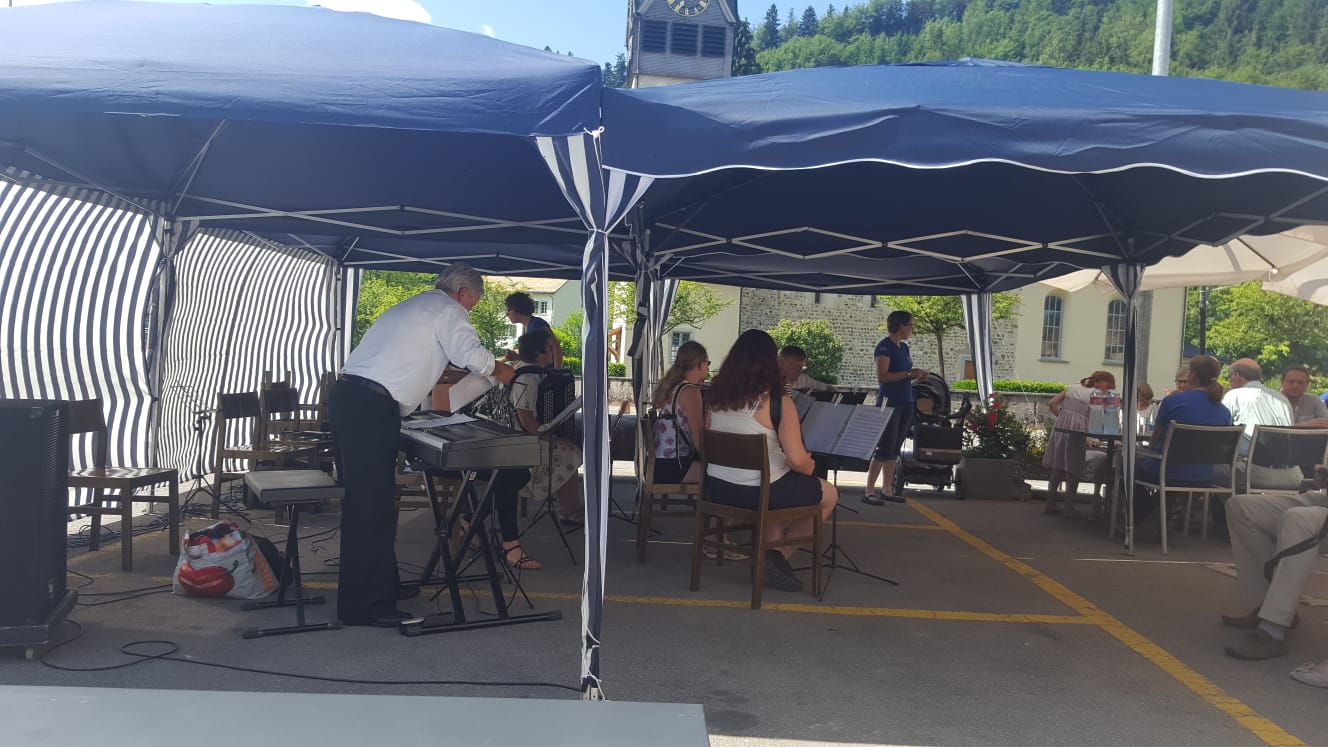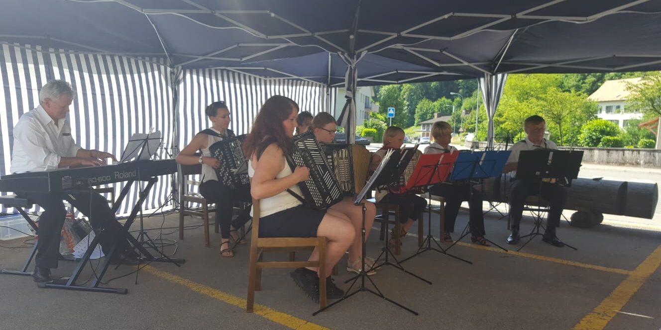 Bei schönstem Sommerwetter fand am Sonntag, 10. Juni 2018 im Restaurant Brückenwaage in Dussnang das Platzkonzert statt. Das Plauschorchester unter der Leitung von Christina Appert eröffnete das Konzert. Für die Gruppe bestehend aus sechs AkkordeonspielerInnen und einem Klavierspieler war es der erste öffentliche Auftritt nach nur drei Monaten gemeinsamer Proben. Sie spielten unter anderem bekannte Volkslieder wie „Das alte Haus“, „Frau Meier“ oder „Guete Sunntig“. Der Probeaufwand und Elan der Spieler wurde mit viel Applaus verdankt und so wurde als Zugabe noch „Als wasd bruchsch“ gespielt. Während die zahlreich erschienenen Gäste das schöne Wetter genossen und kulinarisch von Koni und Heidi mit ihrem Team vom Restaurant Brückenwaage verwöhnt wurden, gab es auf der Bühne, beziehungsweise im Schatten des Partyzeltes einen Umbau und der HSS machte sich bereit für seinen Auftritt.
